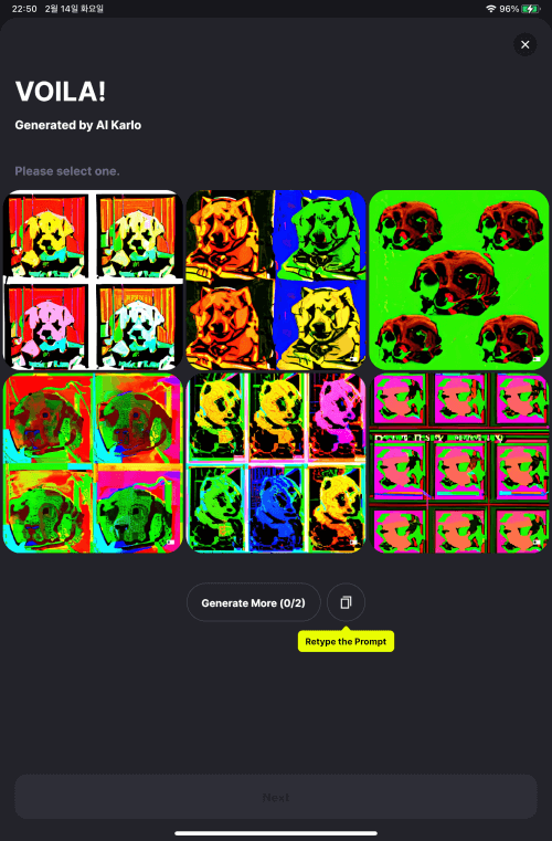 Prompt를 입력하고 나면 바로 다양한 리스트가 나오고 하나를 선택할 수 있습니다. 또 선택을 하면 거기서 베리에이션을 선택할 수 있는 장면이 나오게 됩니다. 제가 비트코인을 트레이닝하는 강아지라고 했는 데 비트코인으로 보이는 물체가 전혀 나오지 않은 게 좀 아쉽네요. 하지만 앤디워홀 스타일로 만들어달라고 하니 그 스타일대로 만들어줘서 만족스럽습니다.