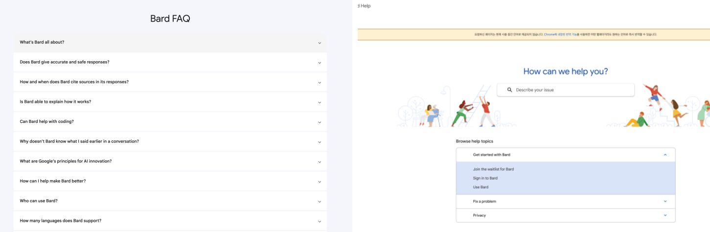 구글 Bard에서 FAQ 및 HELP를 클릭하면 자주사용하는 질문과 도움을 받을 수 있습니다.
